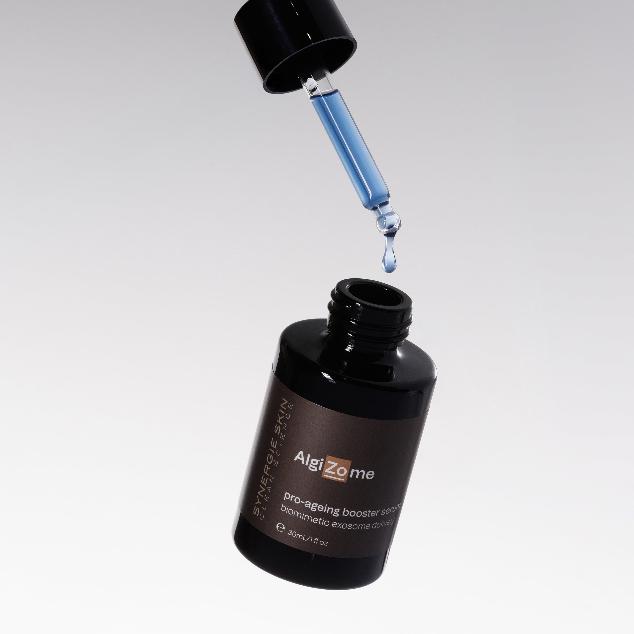 Meet AlgiZome The ultimate pro-ageing booster serum. Powered by ExoMimic™ technology, this advanced formula uses biomimetic exosomes, that are lab engineered from green microalgae to mimic your skin’s natural fibroblast signals. The result? Visibly firmer, more hydrated, radiant skin.